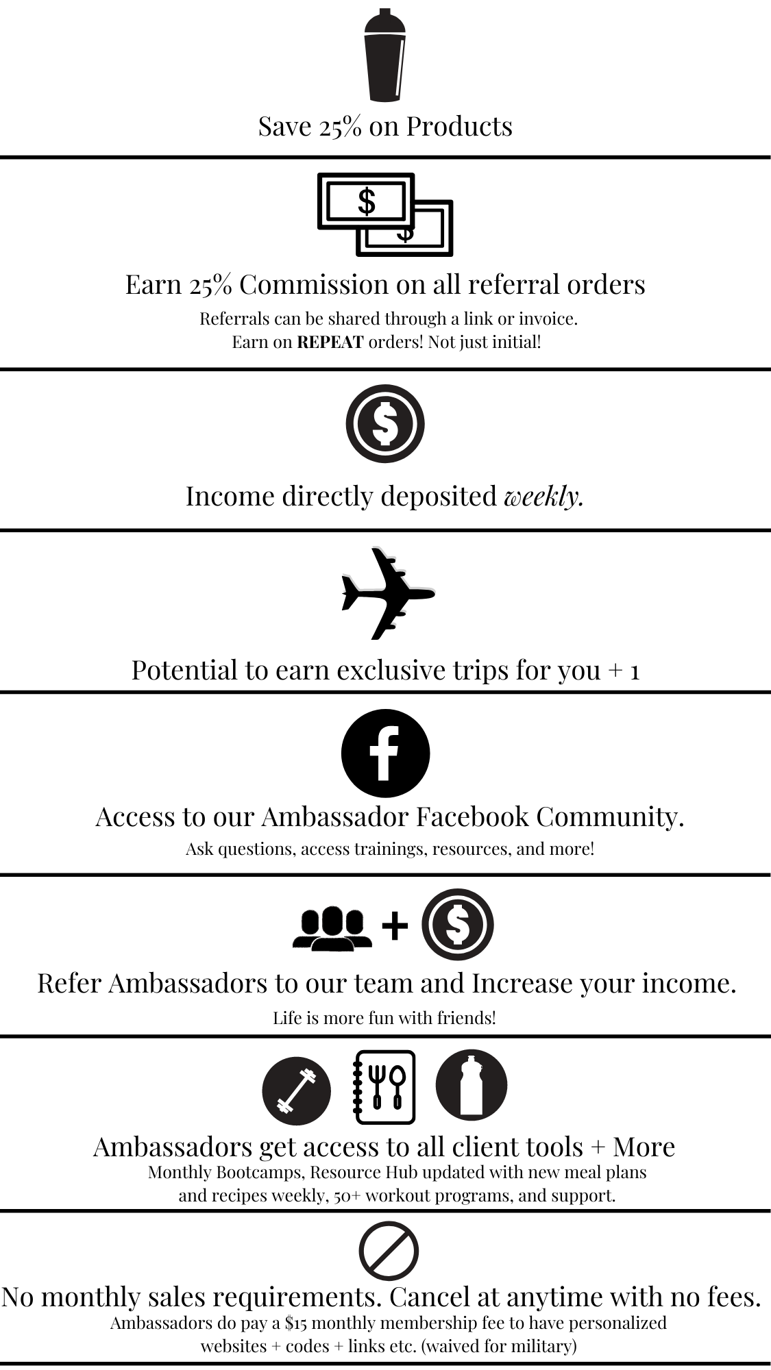 **The below earning example does NOT include any additional supplements or programs the customer may later purchase in which you would also receive commissions for. Such as in adding Energize, Shakeology, Collagen, Bars, or any other upgrades. This also does not demonstrate the earnings you are eligible to earn by bringing in other ambassadors to join our team!